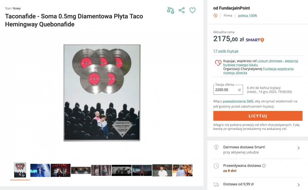 „Album ‘Soma 0.5mg’ wystawiono w ramach kampanii świątecznej na platformie sprzedażowej — aukcja kończy się 14 grudnia o godz. 19:00.”