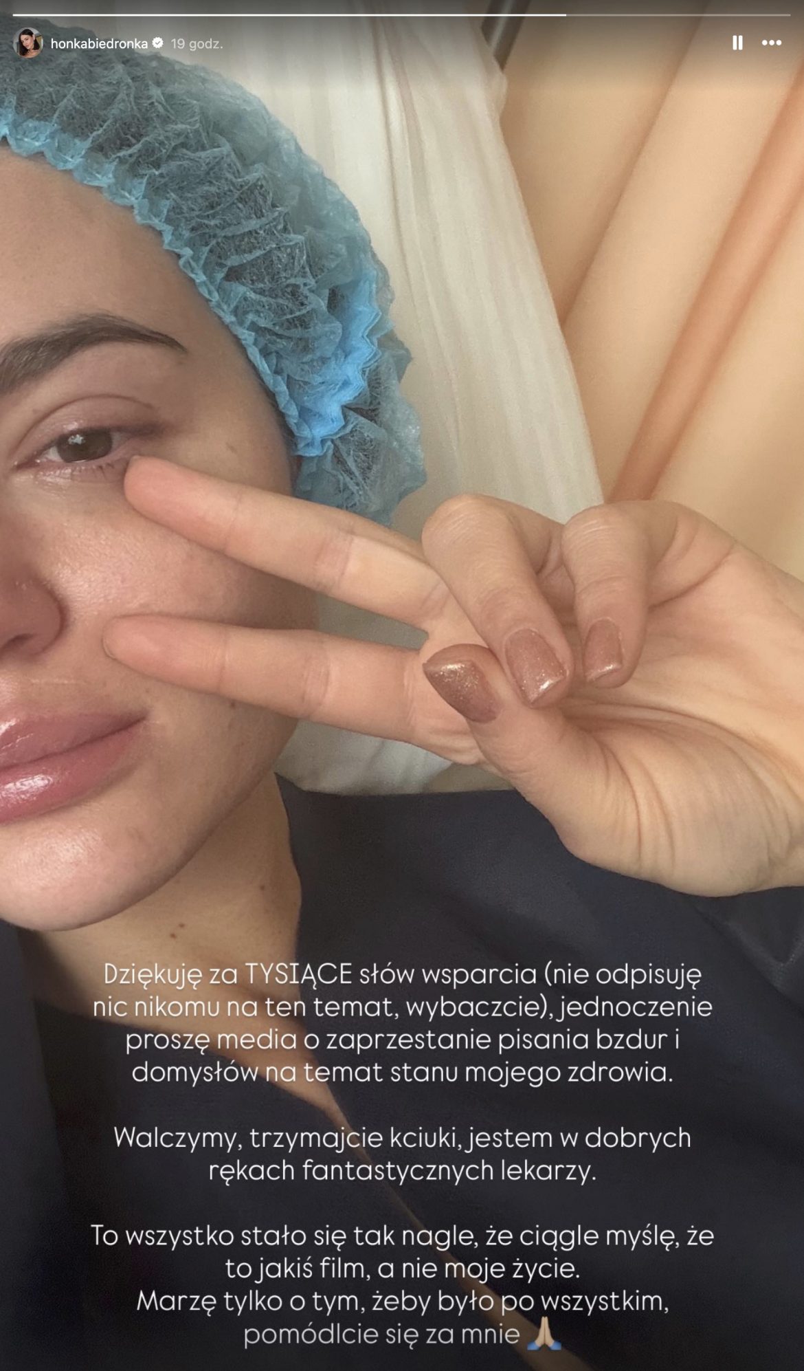 „Dziękuję za tysiące słów wsparcia (nie odpisuję nic nikomu na ten temat, wybaczcie), jednocześnie proszę media o zaprzestanie pisania bzdur i domysłów na temat stanu mojego zdrowia. Walczymy, trzymajcie kciuki, jestem w dobrych rękach fantastycznych lekarzy” – napisała Honorata Skarbek.