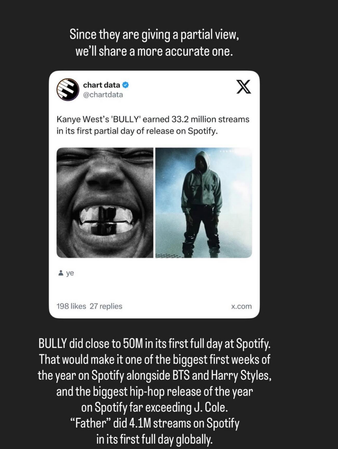 Według ich oświadczenia, rzeczywisty wynik miał wynosić nawet blisko 50 milionów streamów w pierwszym pełnym dniu na Spotify. Jeśli te dane są prawdziwe, „Bully” byłoby jednym z największych debiutów roku.