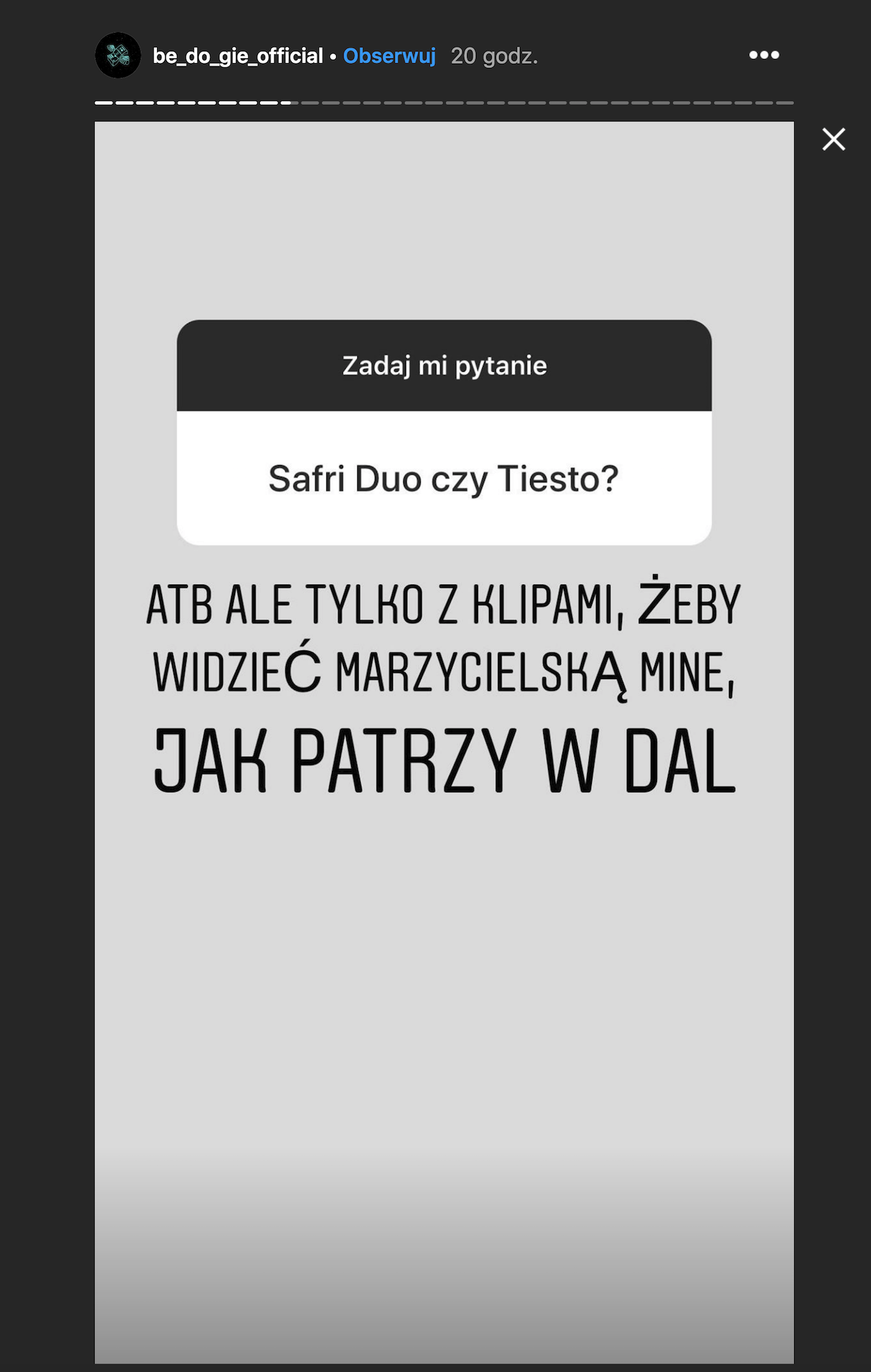 – ATB ale tylko z klipami, żeby widzieć marzycielską minę jak patrzy w dal.